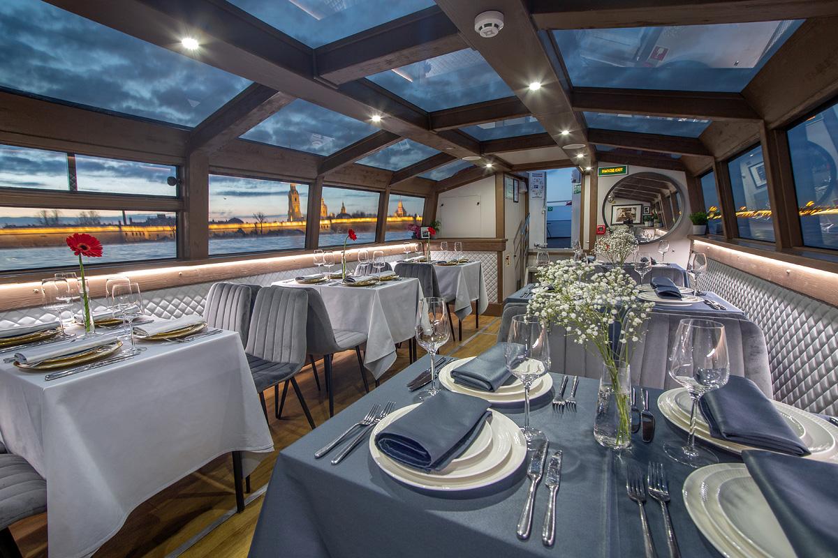 В просторном салоне можно организовать банкет до 36 человек. На борту оборудован уютный зал-ресторан с мощной аудиосистемой. Вы также можете прослушать интересную экскурсию благодаря аудиогиду с подключенной геолокацией.