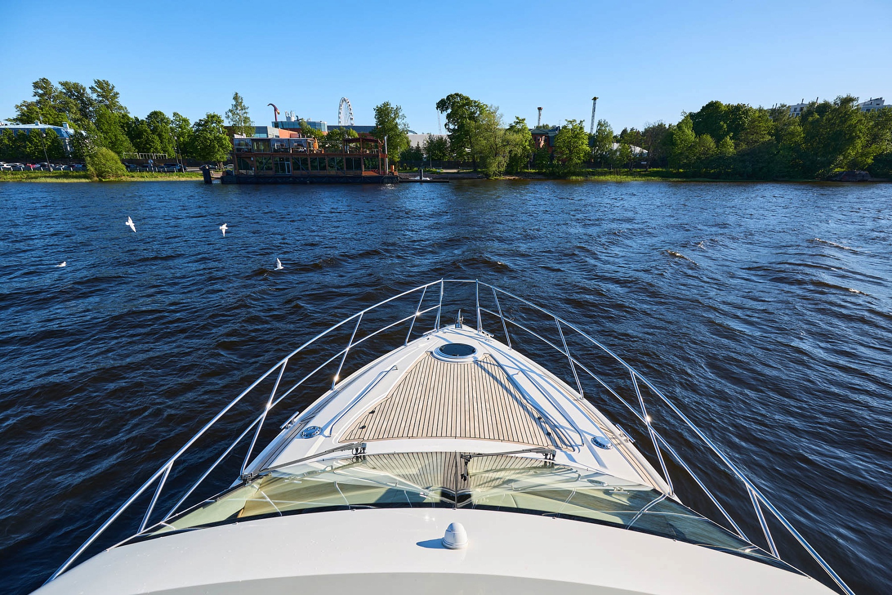 Флайбридж с зоной для загара и грилем — отличное место для отдыха на свежем воздухе. На открытой палубе вы можете провести время в кругу друзей или коллег, наслаждаясь видами Санкт-Петербурга.