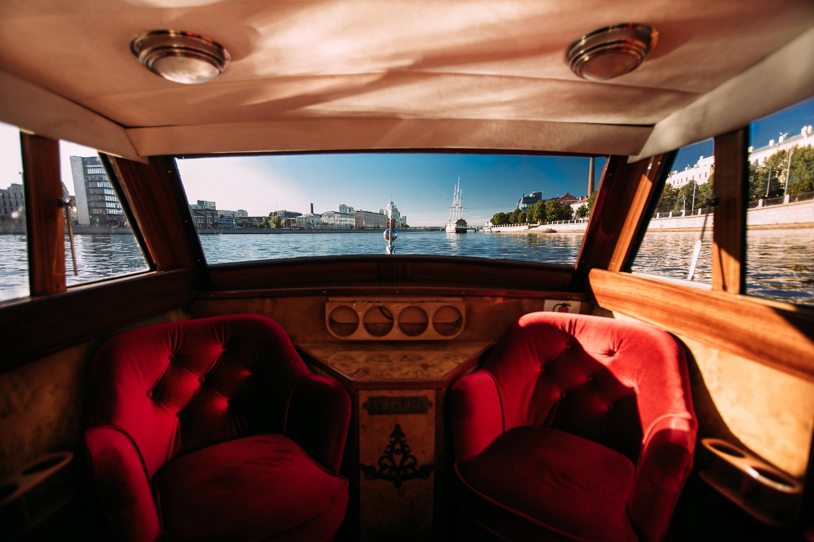 Палуба и салон выполнены из изысканного красного дерева, что создает особую атмосферу роскоши. Мягкие диваны, обогрев салона и тёплые пледы создадут комфорт даже в прохладные дни, а тент защитит от солнца и непогоды. На борту катера предусмотрено всё для вашего удобства: бокалы для праздников, мощная аудиосистема, чтобы насладиться любимой музыкой, и комфортная зона отдыха.