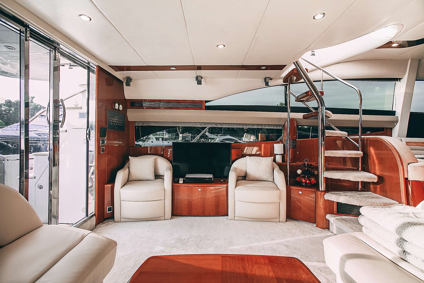 Флайбридж с шезлонгами для загара и открытая зона с диванами и столиками на втором уровне позволят насладиться свежим воздухом и шикарными видами на набережную Санкт-Петербурга. Для вашего удобства на борту оборудованы 2 уборные, душ, уютные каюты, бар, кухня, а также аудиосистема с поддержкой Bluetooth и телевизор. Все продумано до мелочей: теплые пледы, чай, кофе и питьевая вода для всех гостей.