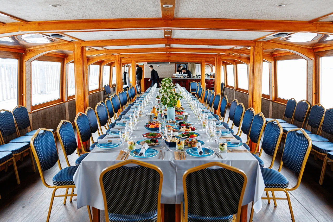 Большой и просторный зал, расположенный на нижней закрытой палубе, оформлен в светлых песочных тонах с отделкой из дерева, что придает интерьеру особый шарм и уют. По желанию клиента зал может быть оформлен в соответствии с тематикой мероприятия, что поможет создать тем самым неповторимую атмосферу праздника.